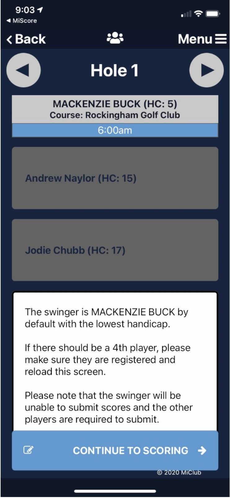 For stand-alone Fourball and if the group is playing as a three then the MiScore App will select the pairings and allocate as the 'Swinger' based on the player with the lowest GA handicap in the group. The 'Swinger' can score but not submit scores at the conclusion of the round. The other two players in the three will be scoring and submitting scores at the end of the round