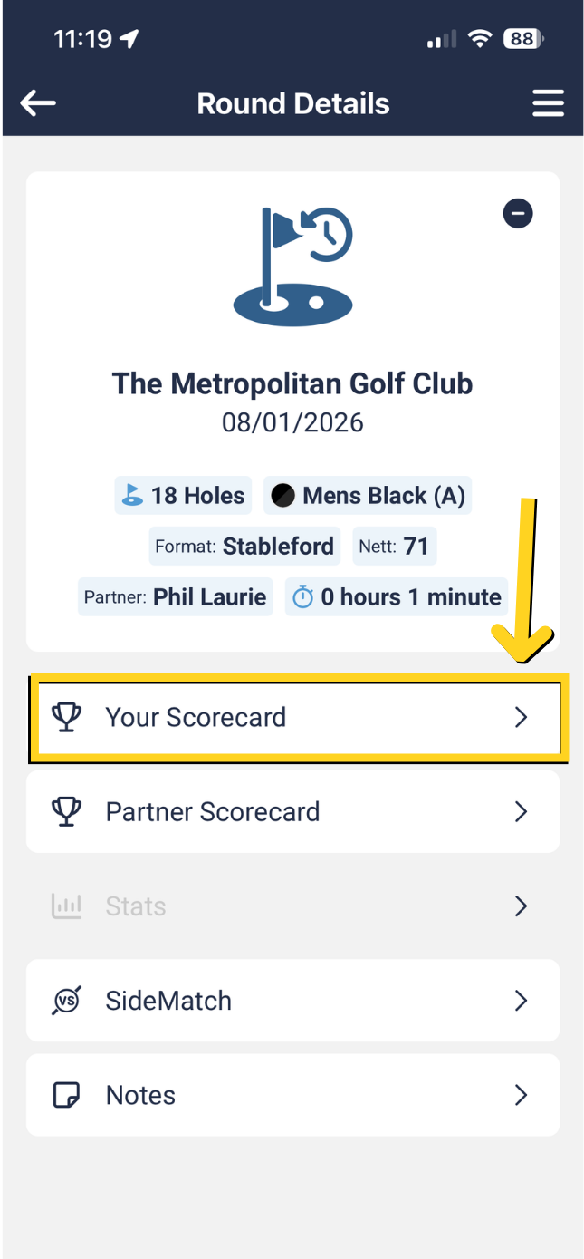 You can either view your scorecard, your partner's scorecard, stats or Sidematch results.