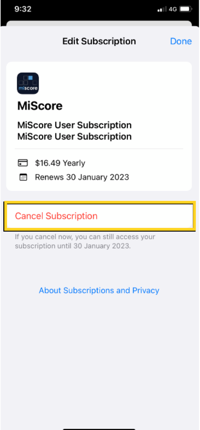 Click 'Cancel Subscription' to end your MiScore User Subscription.