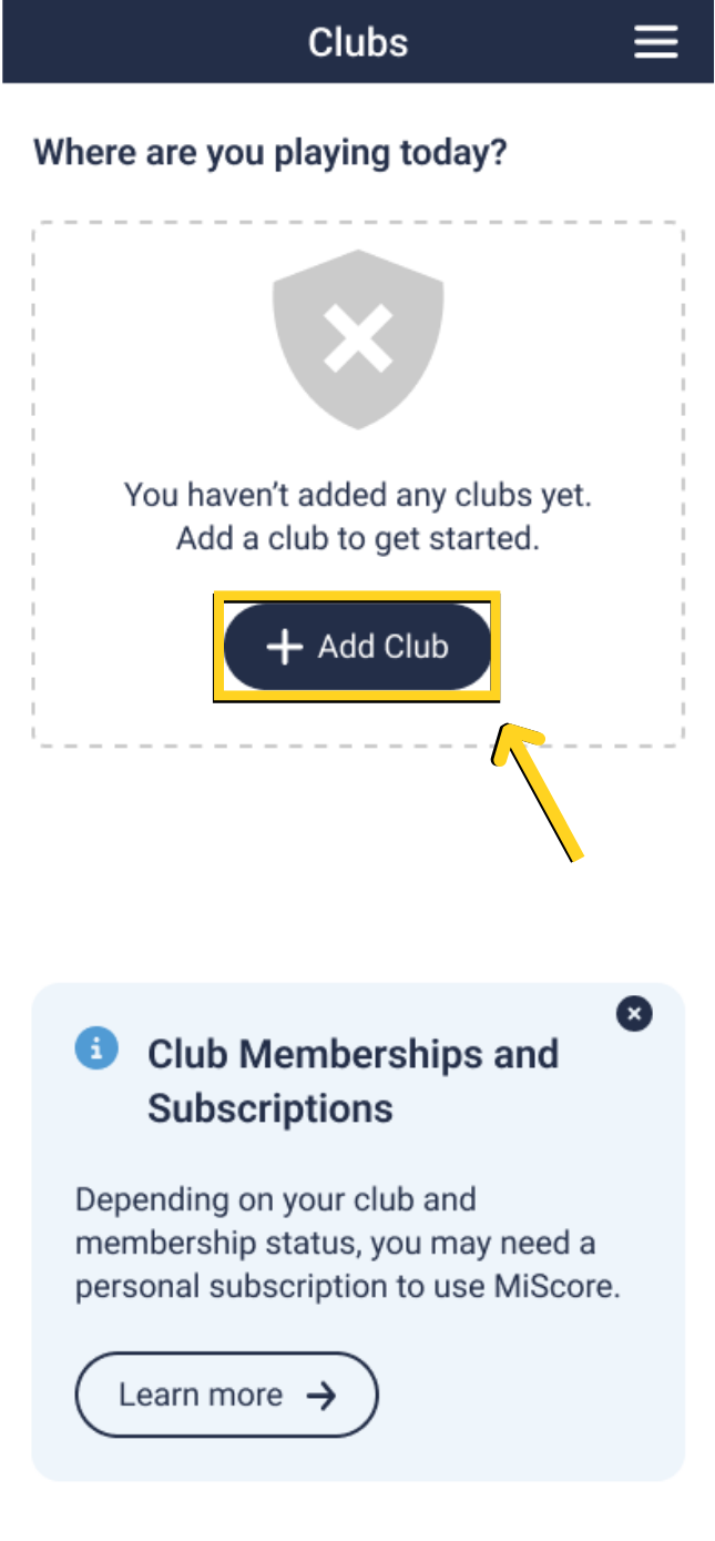 Once you have installed and setup your App profile, the next set is to add your home club by pressing the 'Add Club +' button. You will be asked to search for the club by typing in its name and selecting the query result club name.