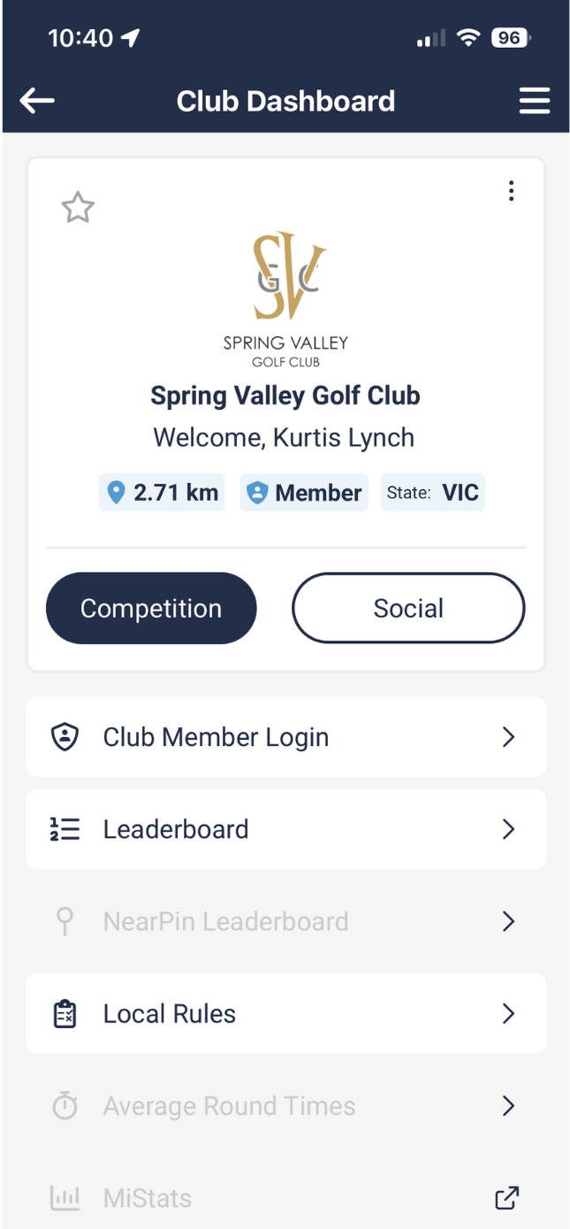 On successful login, your name should appear under the club's logo and you are now ready to score in a comp round or socially.