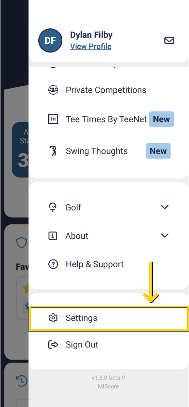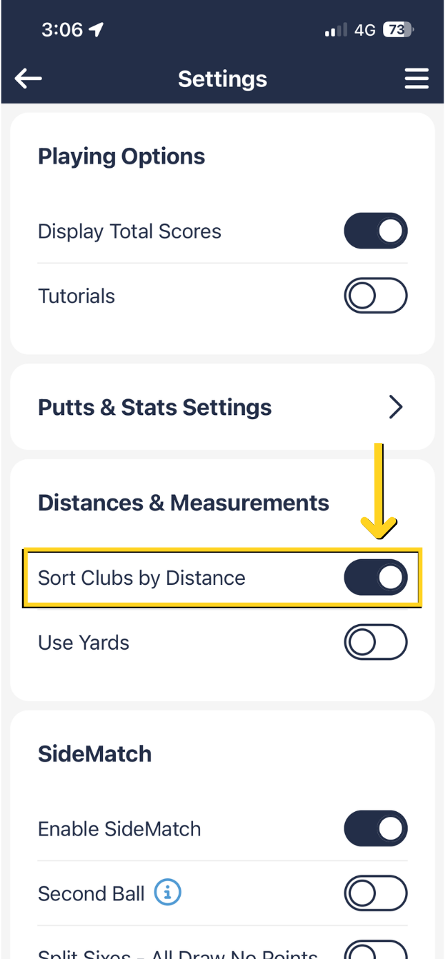 When you enable 'Use Distance to Club Sorting' in settings an app restart will be required to update the distance / location feature. On reload you should notice that the distance to the course will be shown in the left hand corner in KM's.